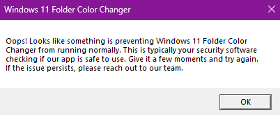 Most security software include features that scan unknown apps. In Windows 11 Folder Color Changer’s case, your security software is probably scanning our app when running it for the first time (or running the app for the first time after updating the app).